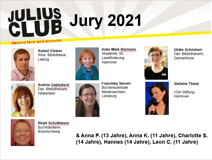 Wer auch schon für den JULIUS-CLUB 2021 aktiv ist, sind unsere JULIUS-CLUB-Jurymitglieder. Neben sieben Erwachsenen nehmen auch fünf Jugendliche im Alter von 11 – 14 Jahren an der Jury teil. Bei allen Jurymitgliedern stapeln sich derzeit aktuelle Kinder- und Jugendbücher auf dem Nachttisch. Die Verlage schicken uns neue Bücher zu, die gerade erschienen sind bzw. noch erscheinen. Diese werden dann von den Jurymitgliedern gelesen und auf „JULIUS-Tauglichkeit“ geprüft. Dabei spielen folgende Kriterien eine Rolle: