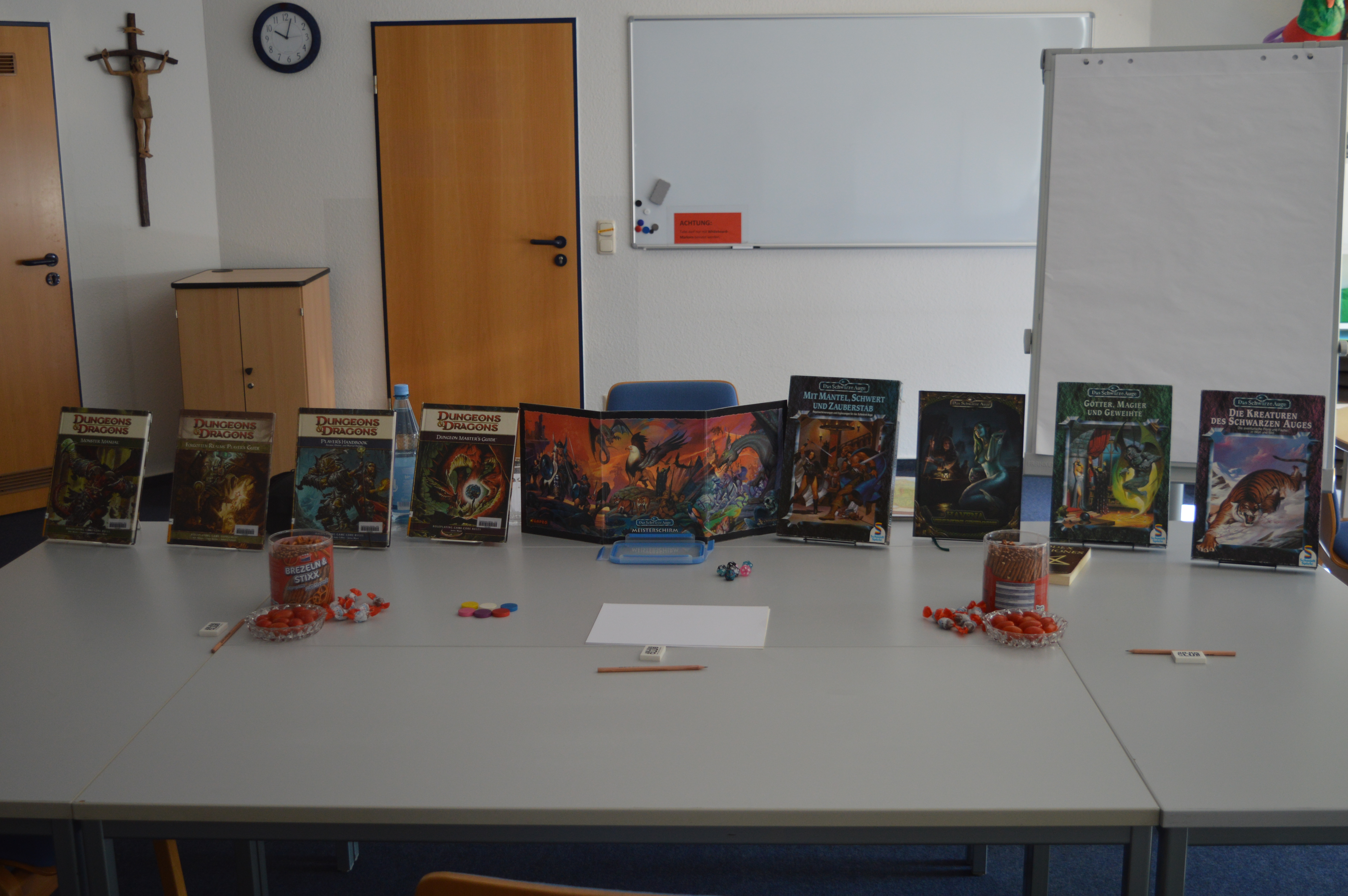Am vergangenen Dienstag war es soweit: im Rahmen des Julius-Clubs gingen drei Mädchen nach einer kurzen Einführung in die Welt der Pen & Paper Rollenspiele auf Abenteuerreise. Als Auelfe „Lyra“, Hellsichtmagierin „Tiara“ und Kampfmagierin „Lissi“ bereisten sie mit Würfeln, Zettel und Stift bewaffnet den Fantasy-Kontinent „Aventurien“ des Rollenspiels „Das schwarze Auge“.