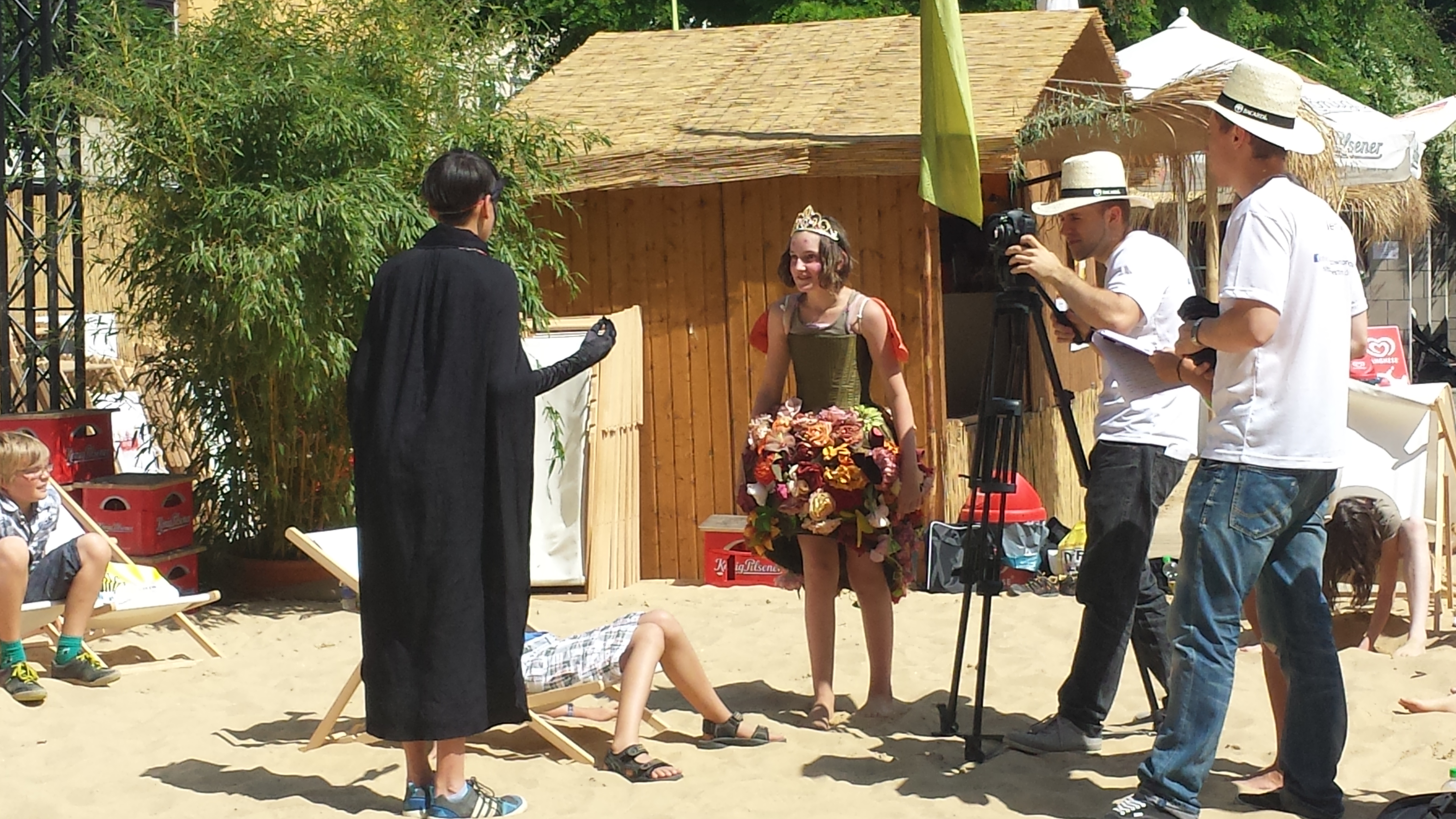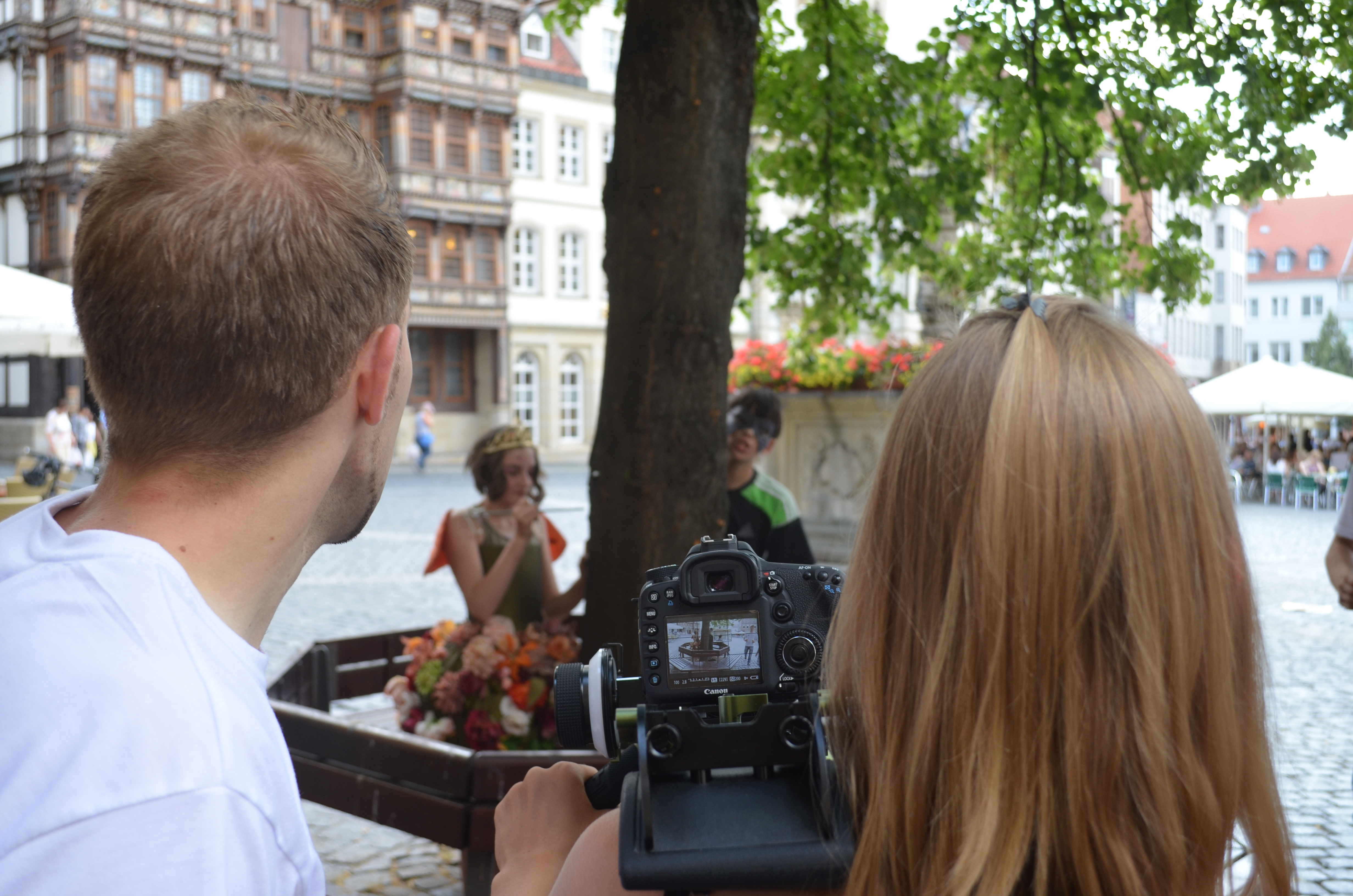 Neben der Bibliothek wurde auch auf dem Hildesheimer „City Beach“ (bei gefühlten 40°C im Schatten) und vor dem Hildesheimer Rathaus gedreht.