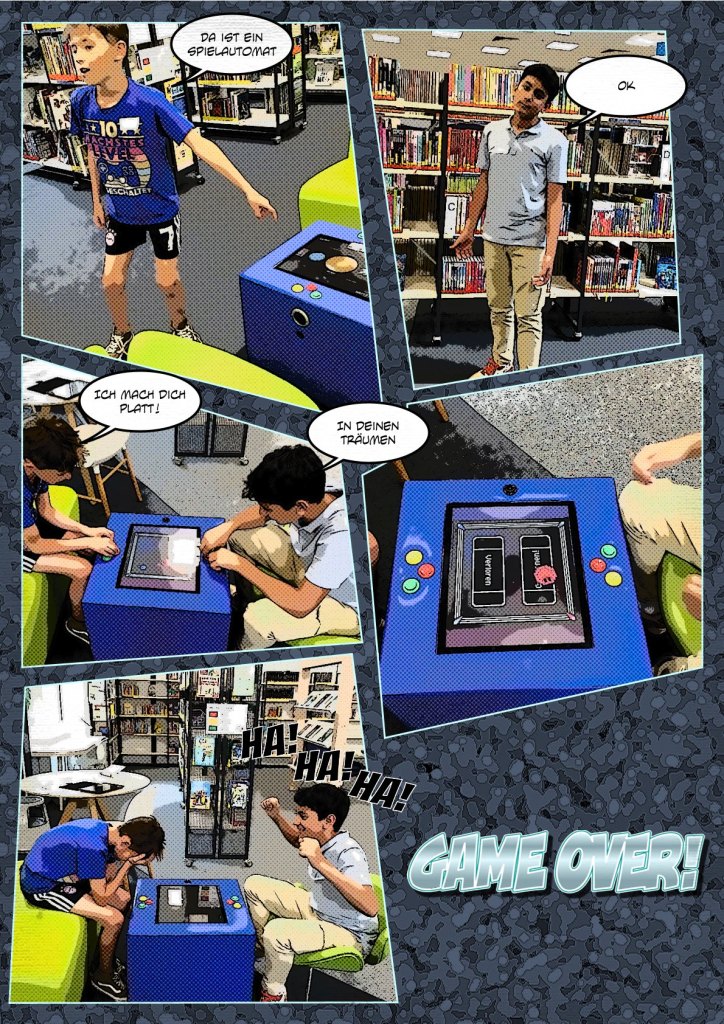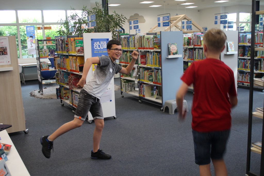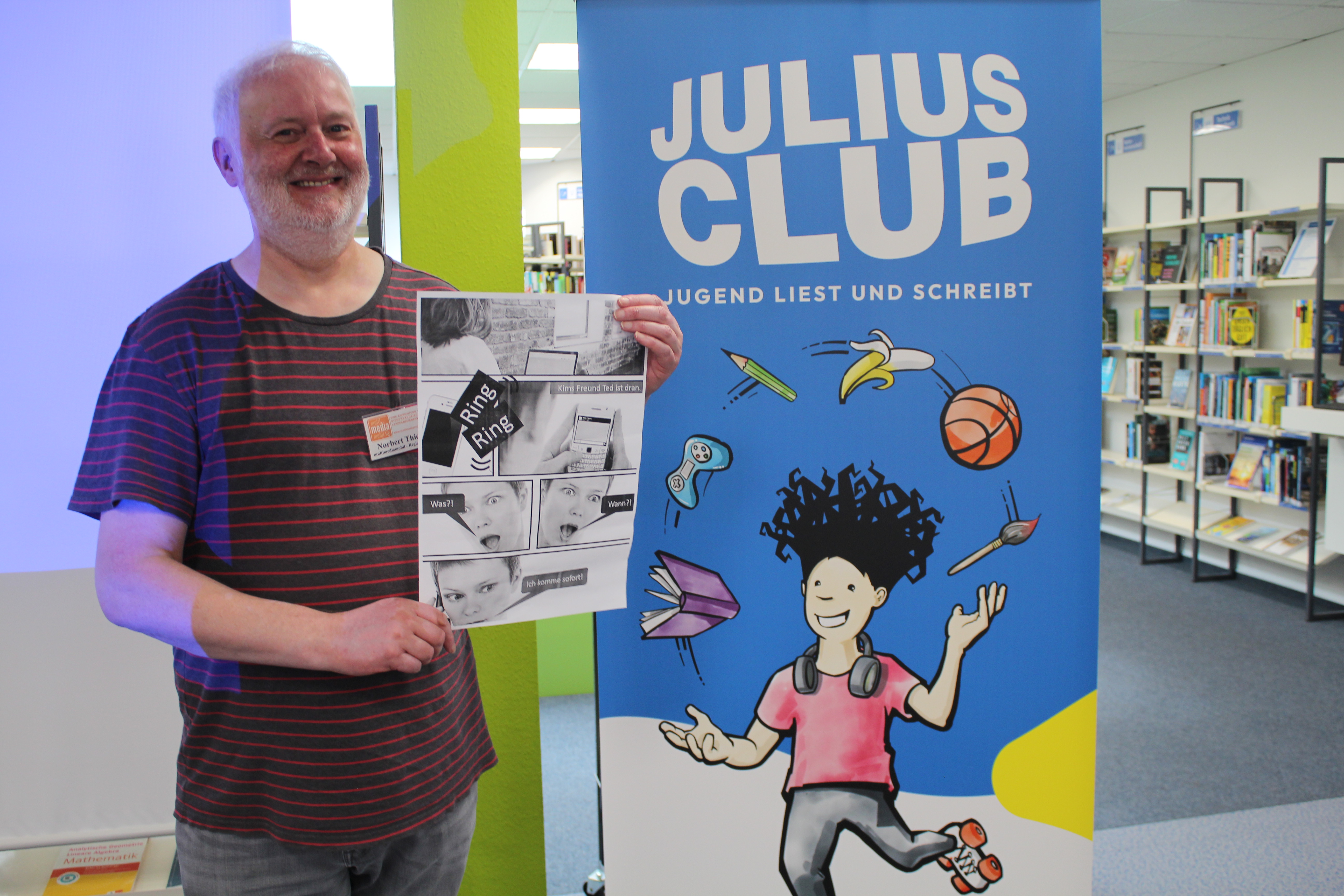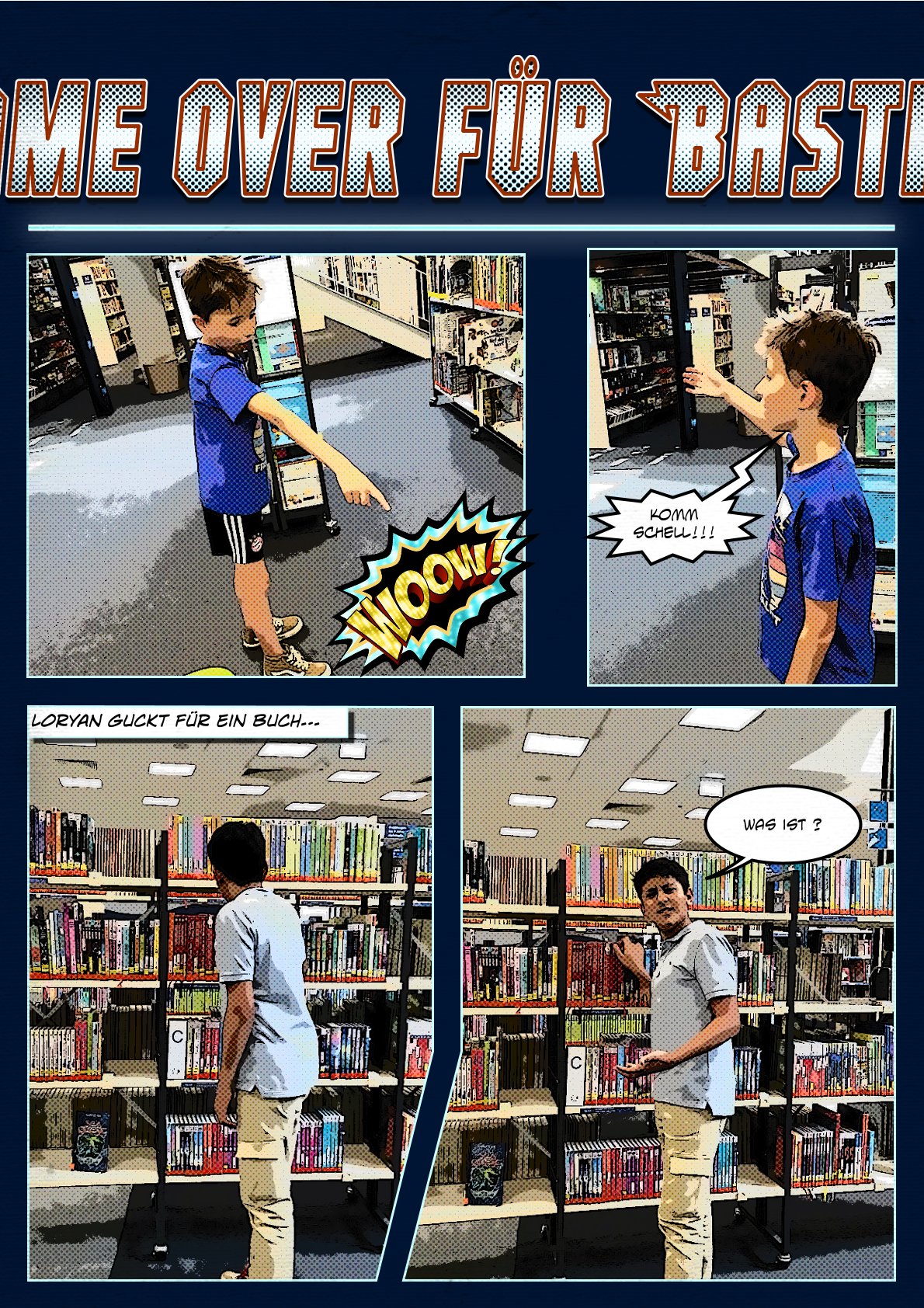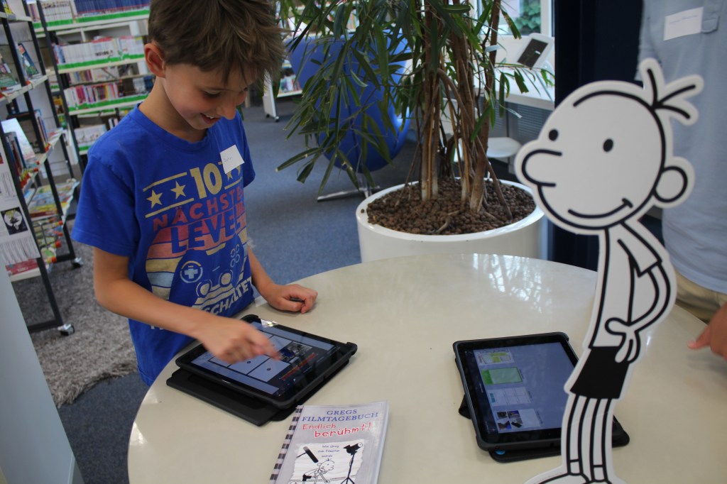 So lautete die Aufgabe für die Mädchen und Jungen, die nach kurzem Grübeln unterschiedliche Orte in der Hildesheimer Stadtbibliothek für ihre Ideen nutzten. Die kreativen Teams arrangierten, fotografierten und texteten mit witzigen, fantasievollen Ergebnissen. „FUB“ – Und ich bin zurück in der Realität“ freute sich Bastian, nachdem er zuvor in Gregs Tagebuch verschwunden war. „Genial!“ fand Referent Norbert Thien vom Multimediamobil Südniedersachsen die entstandenen, sehr fantasievollen Comics. Eine tolle Veranstaltung, in der sogar neue Freundschaften zwischen den Julianer:innen entstanden.