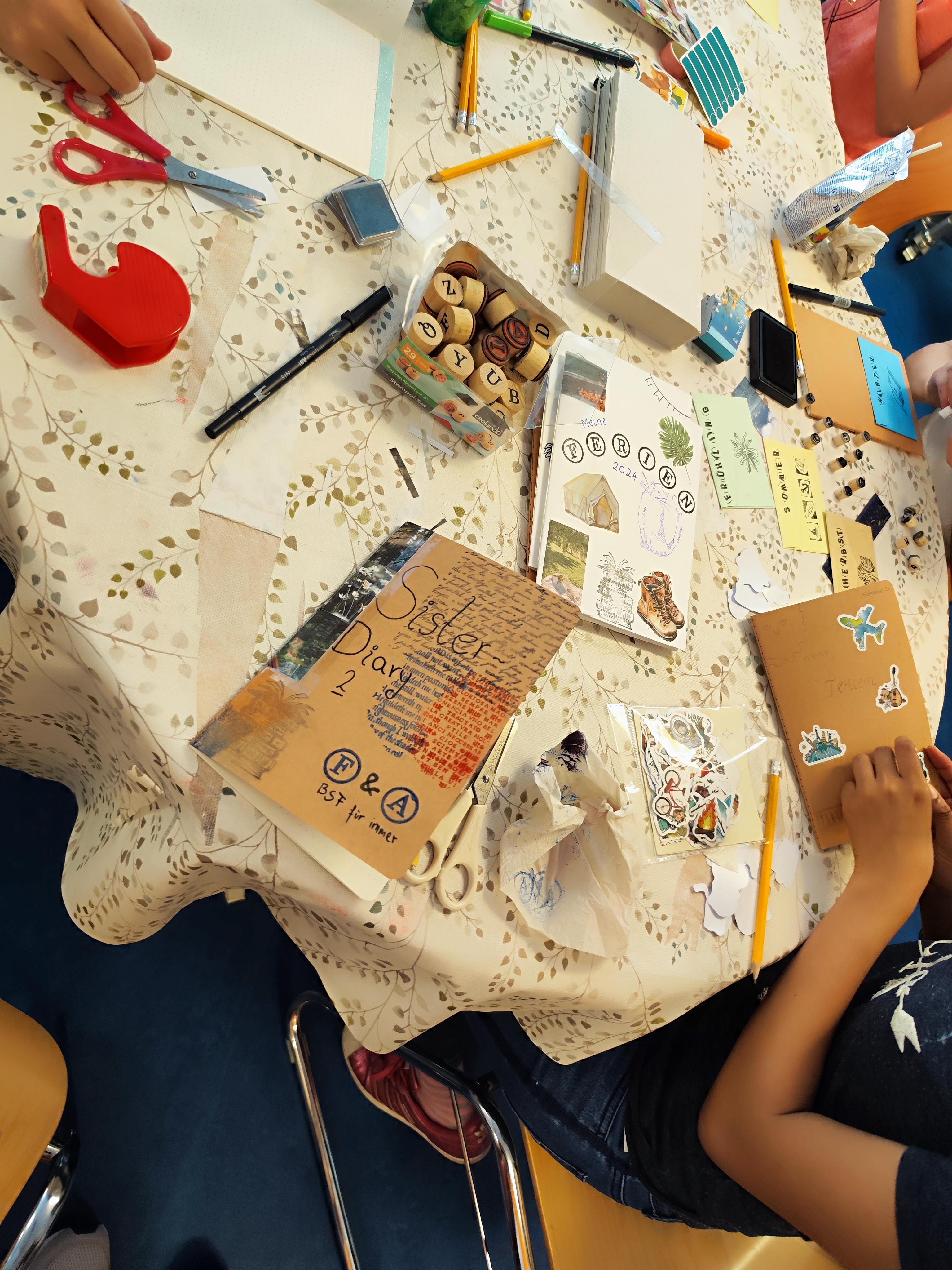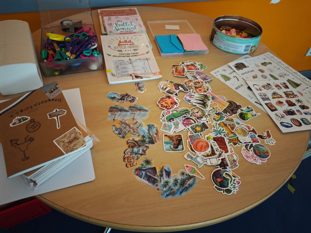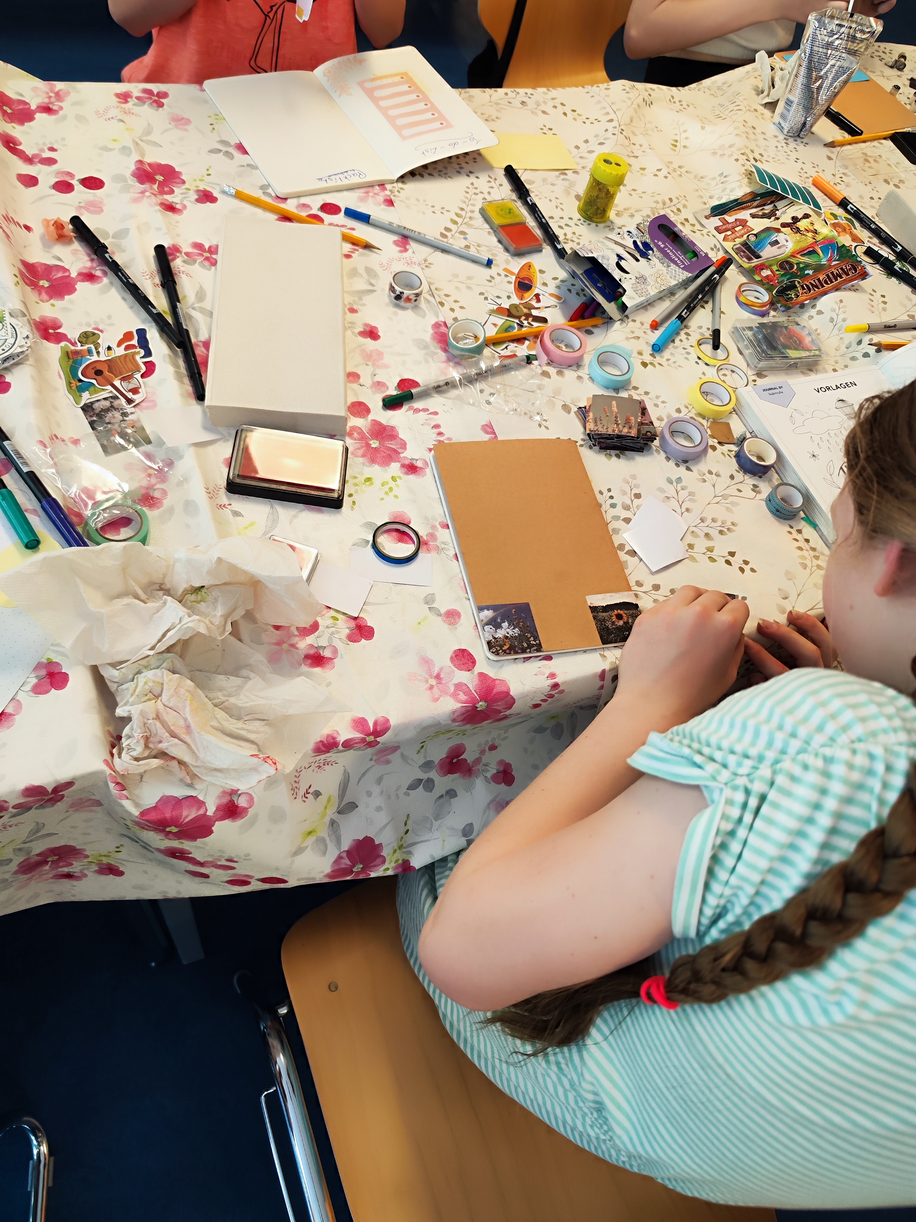 Am letzten Schultag fand in der Südstadtbibliothek ein JULIUS CLUB-Workshop statt, bei dem Kinder und Jugendliche die Möglichkeit hatten, ihr eigenes Ferienjournal zu gestalten. Mit viel Kreativität und Begeisterung wurden Hefte verziert – mit Aufklebern, Stempeln, Handlettering und Vorlagen aus dem Bullet Journal.