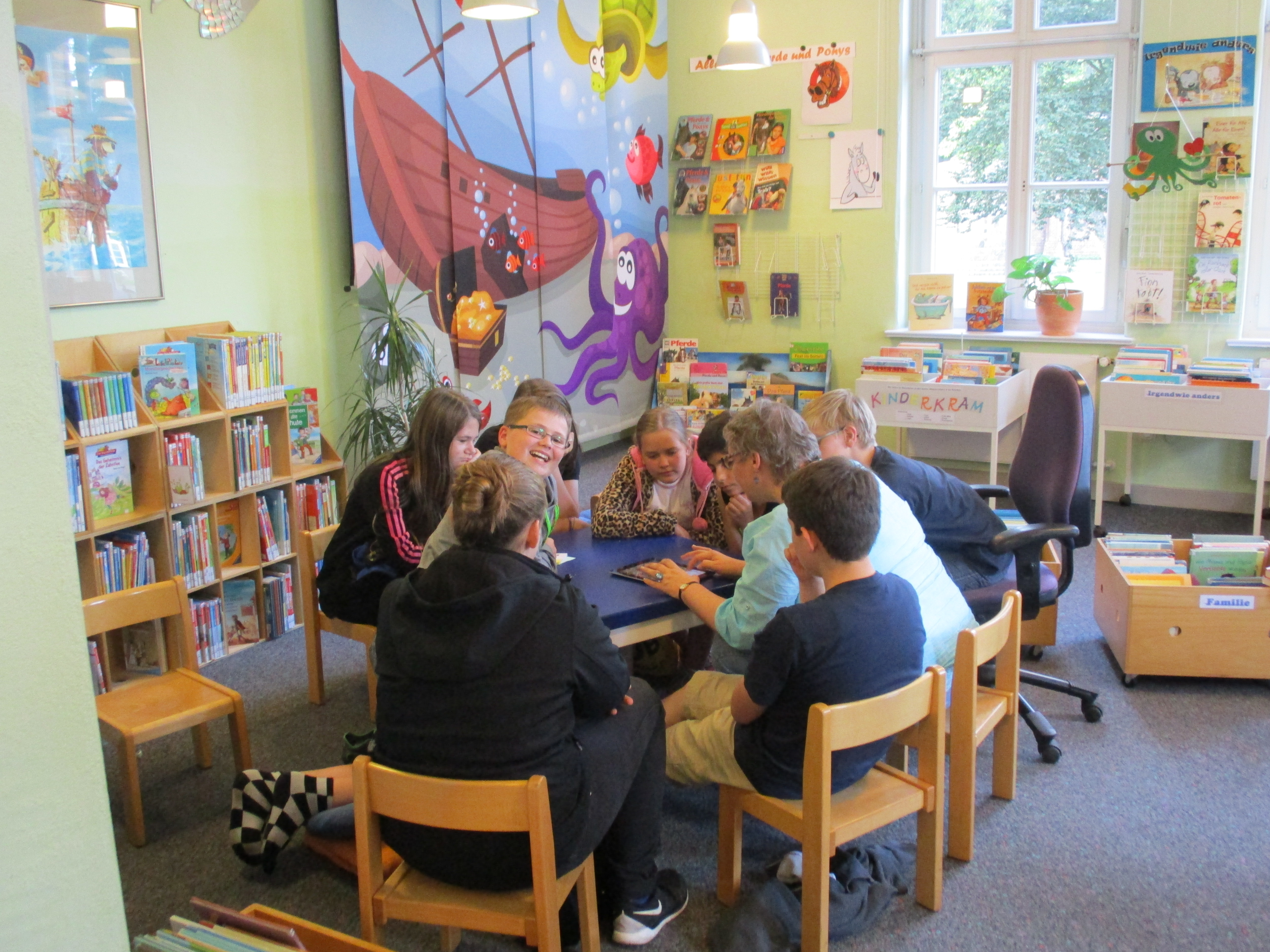 Bei angenehmem Sommerwetter hatten wir am Donnerstag, 23. Juli, mit den JULIANERN “Fantastische Ferien im Paradies”. Die fast 30 Kids hörten zunächst in drei Gruppen je halbstündige Ausschnitte aus verschiedenen JULIUS-Büchern, gelesen von Nadine Dehning, Bürgermeister Andreas Weber und Christine Braun um dann auf der Wiese hinter der Bibliothek zu grillen und zu chillen. Dazu gab es die zuvor selbst aufgenommenen skurrilen Geschichten, die mit der App “Story Wheel” erstellt worden waren.