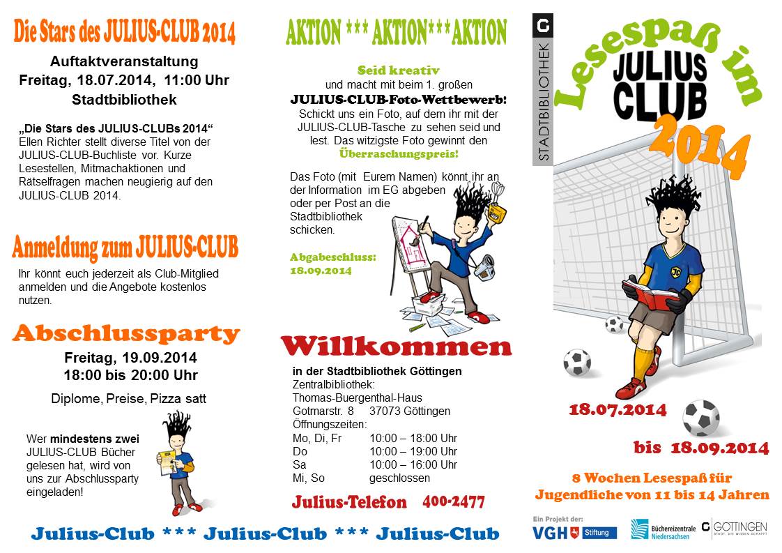 50 Bibliotheken aus Niedersachsen kamen am 26. März 2014 in Hannover zusammen, um den offiziellen Auftakt zum JULIUS-CLUB 2014 zu begehen. Das Sommer-Lese-Event findet bereits zum achten Mal statt. Koordiniert wird es von der VGH-Stiftung und der Büchereizentrale Niedersachsen. Vom 18. Juli bis zum 18. September 2014 wird in Niedersachsen wieder gelesen, bewertet, gefilmt, gebastelt, fotografiert, geslamt, gerappt, gemalt … Dem Einfallsreichtum rund um die 100 JULIUS-CLUB-Titel sind keine Grenzen gesetzt.