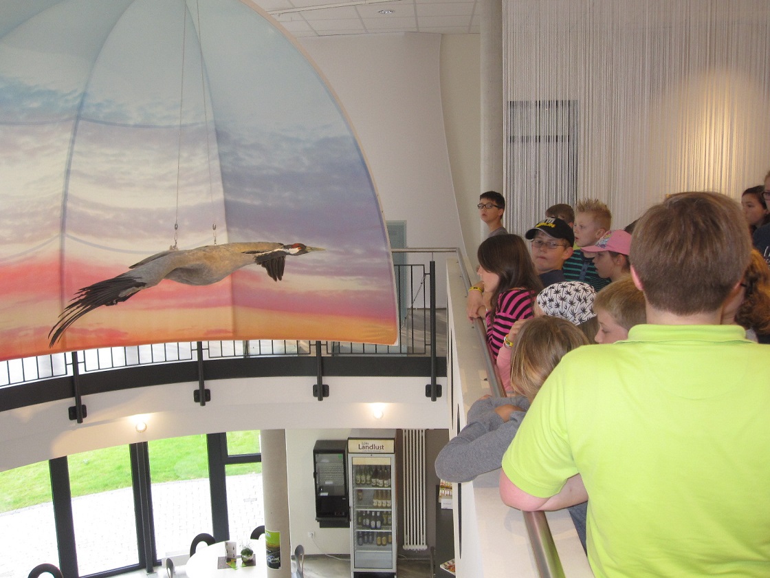 Von leichtem (Moor-)Nebel begleitet brach am frühen Mittwochmorgen eine gut gelaunte Gruppe von 29 Kindern (teils vom Jugendfreizeitzentrum teils aus JULIUS-Club Teilnehmern) und sieben Begleitern zu einem Erlebnisstreifzug in die Moorwelten (Europäisches Fachzentrum MOOR und KLIMA) in Wagenfeld auf. Dort angekommen wurden wir sehr nett von zwei Tour Guides begrüßt und durch die Erlebnisausstellung geführt. Auf diesem Weg machten wir u.a. Bekanntschaft mit dem alten Kranich „Hugo“, der sein Leben an einem Strommast ausgehaucht hat und dadurch in die „inneren Moorwelten“ vorgedrungen ist.