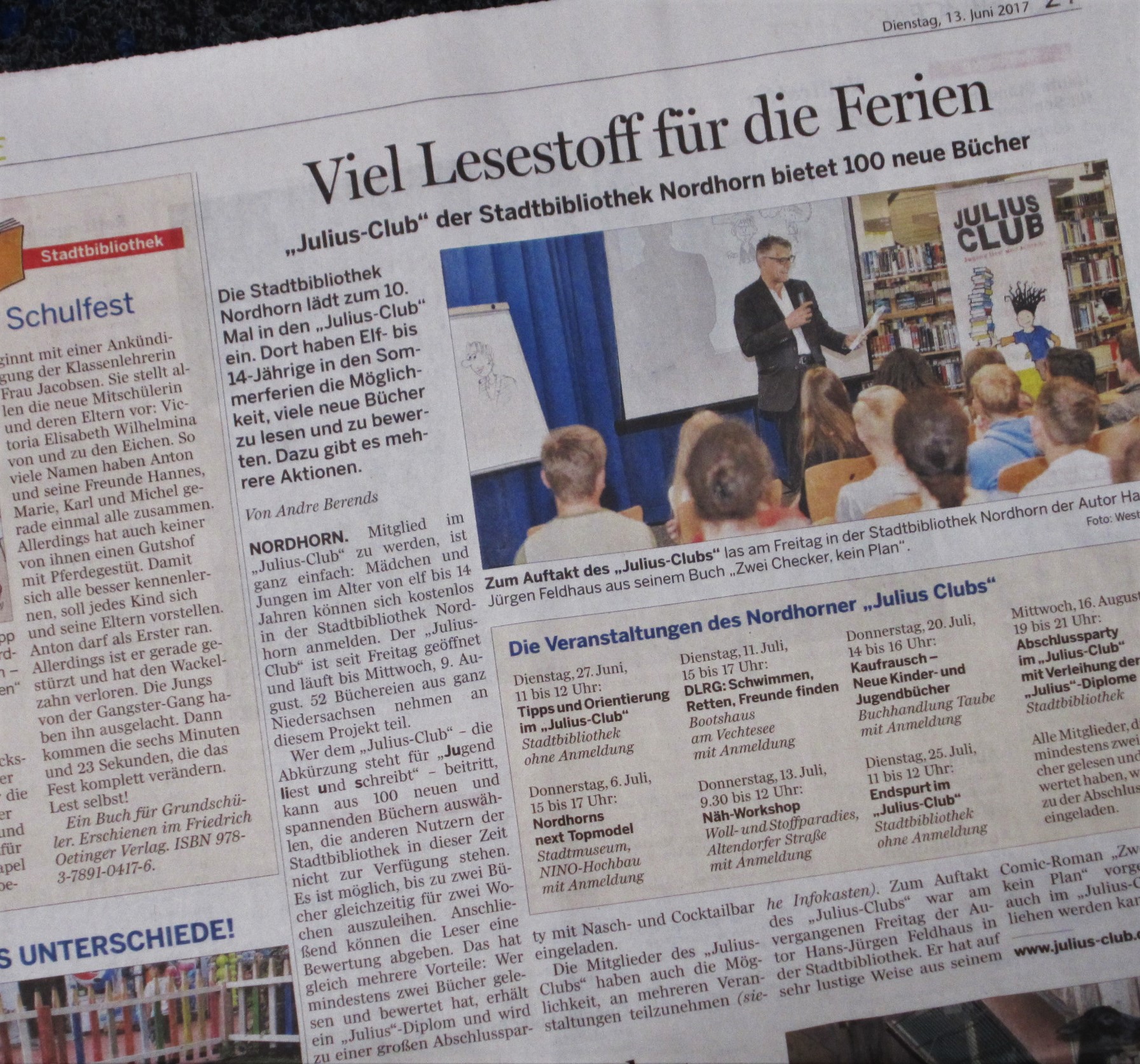 Jeden Dienstag gibt es in unserer Tageszeitung „Grafschafter Nachrichten“ eine extra Kinderseite. Heute mit dem Bericht über den JULIUS-CLUB in Nordhorn. Wie klasse ist das denn. Wenn gerade mal kein JULIUS-CLUB läuft und auch dann: Ein Tipp aus der Stadtbibliothek ist in jedem Fall auf der Kinderseite der „Grafschafter Nachrichten“.