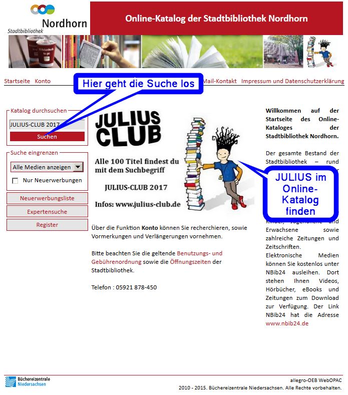 Kurz vor der Mittagspause haben wir uns gefragt, warum wir keine Werbung auf der Startseite vom Online-Katalog machen. Dann haben wir erstmal tüchtig gegessen. Dann die Kollegen der EDV von unserer Idee überzeugen können (Schokolade spielte dabei eine gewisse Rolle) und jetzt hat die Startseite vom Online-Katalog einen Hinweis auf unseren JULIUS-CLUB [klick].