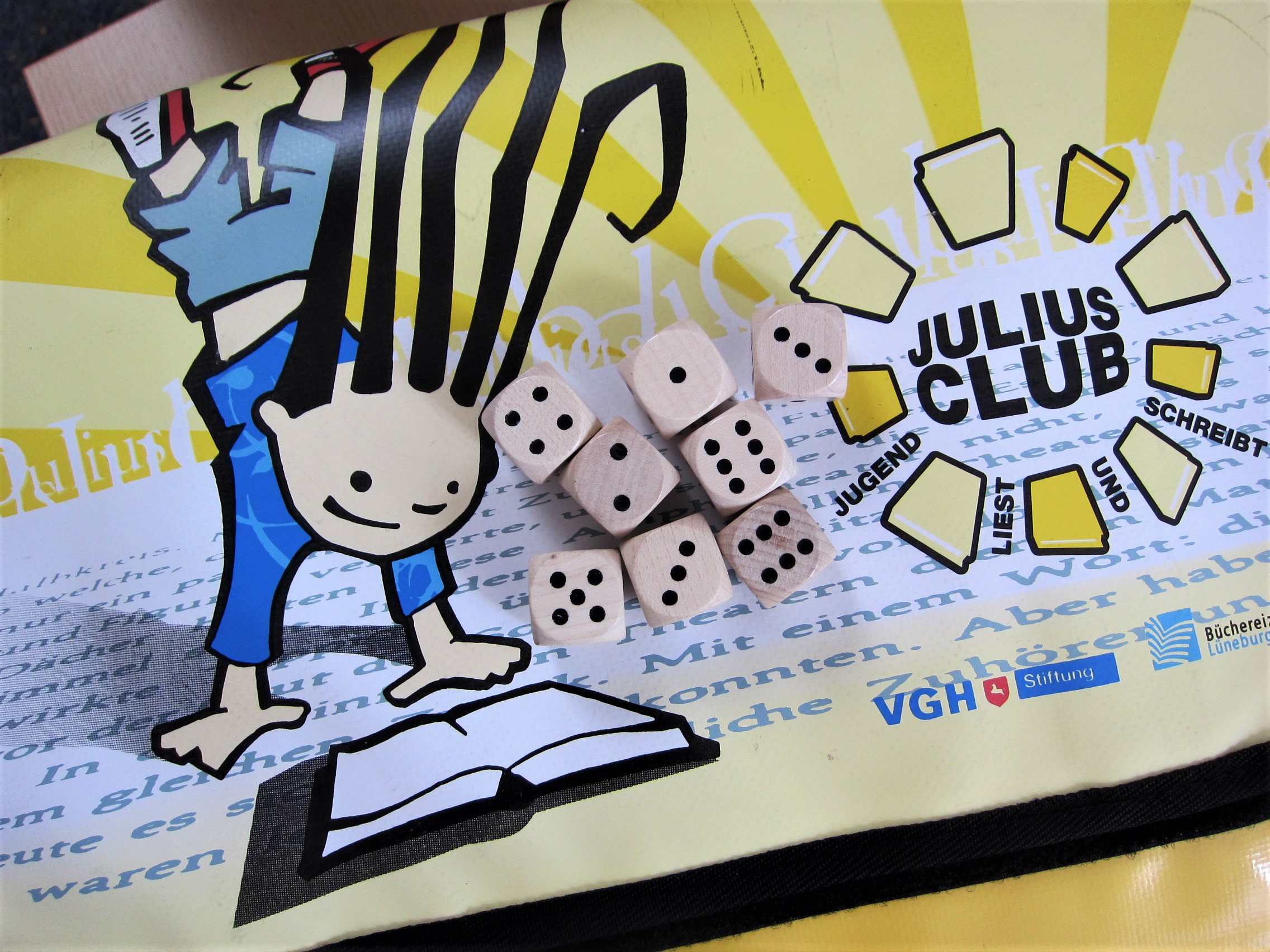 In diesem Jahr muss das Glück mit den Schülern sein! Es wird um die Informationen zu den JULIUS-CLUB Büchern gewürfelt. Wir werden wohl mit zehn Büchern, gut getarnt in superhyperneutralem Packpapier unterwegs sein. Zu jedem Buch gibt es sechs Informationen und je nach gewürfelter Zahl verraten wir eine. Möglicherweise es ist die Seitenzahl, ein Textausschnitt, ein Kommentar, ein Illustration oder sonstwas.